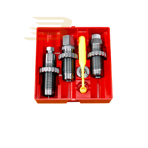 Lee Handgun Carbide 3-Die Set includes Carbide Full Length Sizing Die, Bullet Seating Die, Powder Thru Expanding Die, Universal Shell Holder, Powder Dipper and Instructions/Load Data.